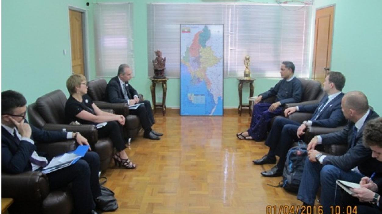 The delegation led by Mr. Alexander Dianov, Deputy Director of Asia, Africa & Latin America Department, Ministry of Economic Development of The Russian Federation visited the office of Directorate of Investment and Company Administration (DICA) ( No.1, Thitsar Street, Yankin Township) in Yangon at 10:00 p.m on 1st April, 2016 and cordially discussed with officials of DICA on the matters relating to the investment.