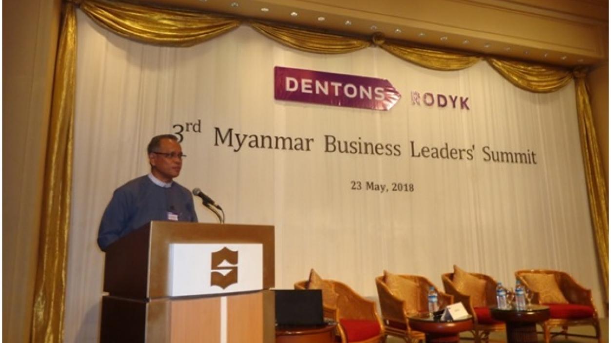 U Aung Naing Oo, Director General of the Directorate of Investment and Company Administration, Ministry of Planning and Finance attended “3rd Myanmar Business Leaders’Summit” which is hosted by Dentons Rodyk, Singapore law firm on 23rd May 2018 at the Sule Shangri-La Hotel in Yangon. At the event, Director General delivered a keynote speech and participated as a panelist in the panel discussion section regarding Myanmar’s Business Attraction Over 2017 and the Outlook for 2018 and Beyond.