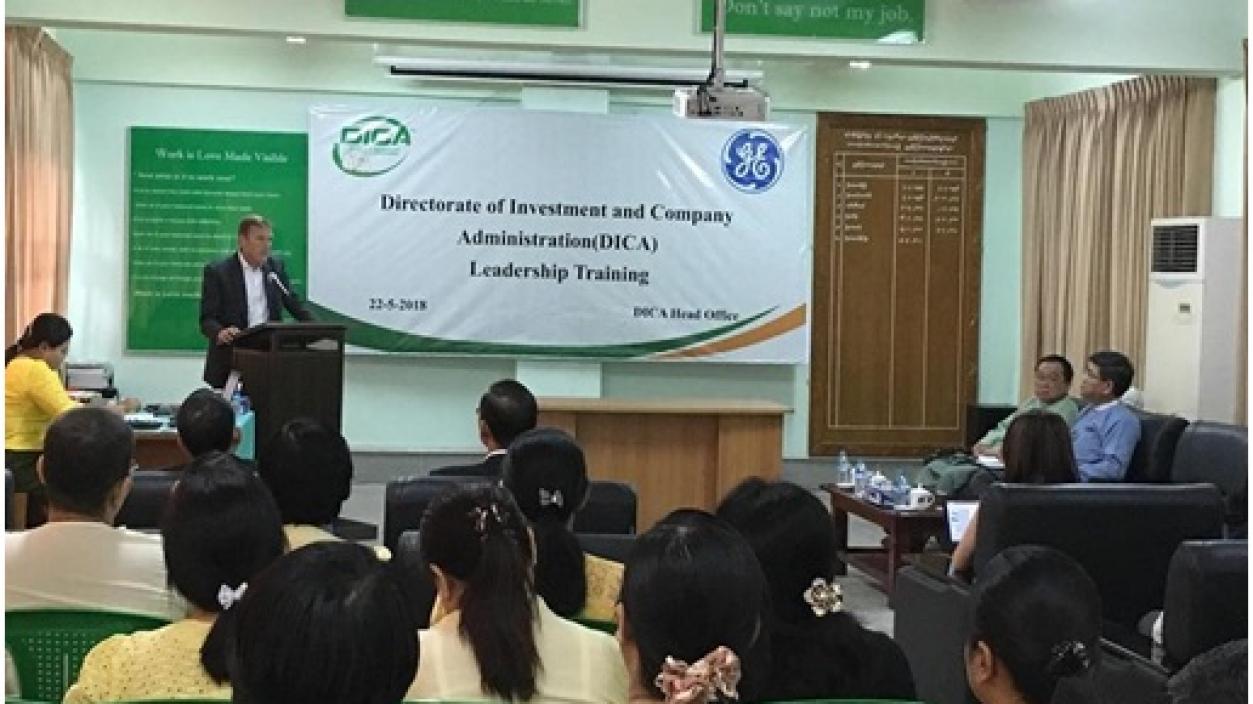 DICA leadership training sponsored by Global Growth International Incorporation was delivered to DICA’s officials to undertake their responsibilities by enhancing their leadership skills efficiently. The training was held at the DICA head office on 22nd May 2018. U Than Aung Kyaw, Deputy Director General, made on opening address followed by Mr. Wouter Van Wersch, President and CEO of GE Asia Pacific. The training was attended by 55 officials, notably Deputy Director Generals, Directors and Deputy Directors from DICA head office.