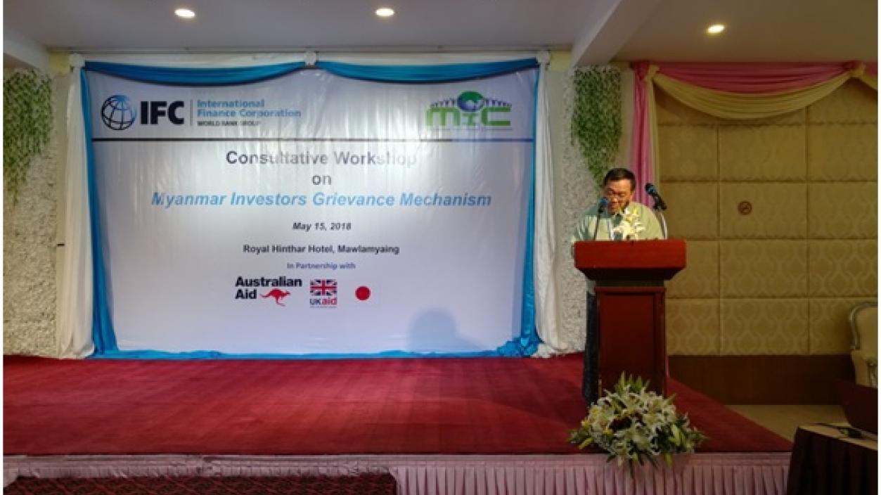 The Consultation workshops for Investor’s Grievance Mechanism (IGM) was held at Royal Hinthar Hotel, Mawlamyaing on 15th May 2018 with the collaboration of the Myanmar Investment Commission and International Finance Cooperation (IFC) for respective officials of regions and states from lower Myanmar.
