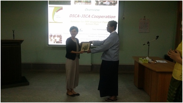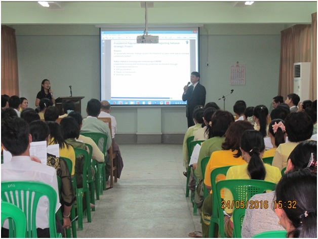 Directorate of Investment and Company Administration (DICA) with the collaboration ofJapan International Cooperation Agency (JICA), the Seminar on PPP Awareness to DICA Staffwas conducted at DICA office in Yangon today (24th May 2016). It was attended by a total of 100 participants including Deputy Director Generals, Directors, Deputy Directors, staff and 6 Representatives from JICA Myanmar Office.