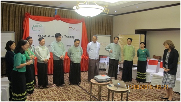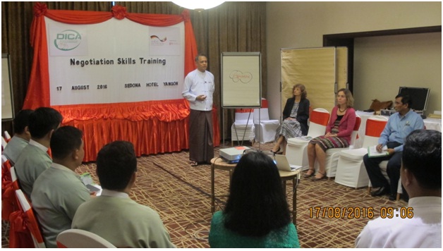 With the assistance of the Germany International Cooperation Agency (GIZ), the training on negotiation skills was conducted at Sedona Hotel, Yangon on 17th August 2016. The objective of the training was to further enhance the negotiation skills and practices of DICA’s negotiators and Trade’s negotiators who are responsible for trade and investment agreements with governments, businesses and other organizations. The training was attended by Director General, Deputy Director Generals, Directors from the Directorate of Investment and Company Administration and Directors, Deputy Directors from Ministry of Commerce respectively.