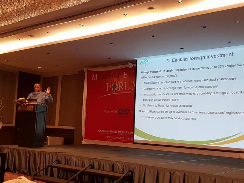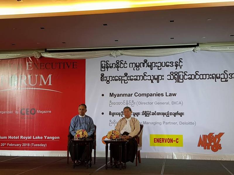 U Aung Naing Oo, Director General of the Directorate of Investment and Company Administration attended “Myanmar Executive Forum” which was organized by CEO Magazine, on 20th February 2018 at Chatrium Hotel and explained the key elements of Myanmar Companies Law.