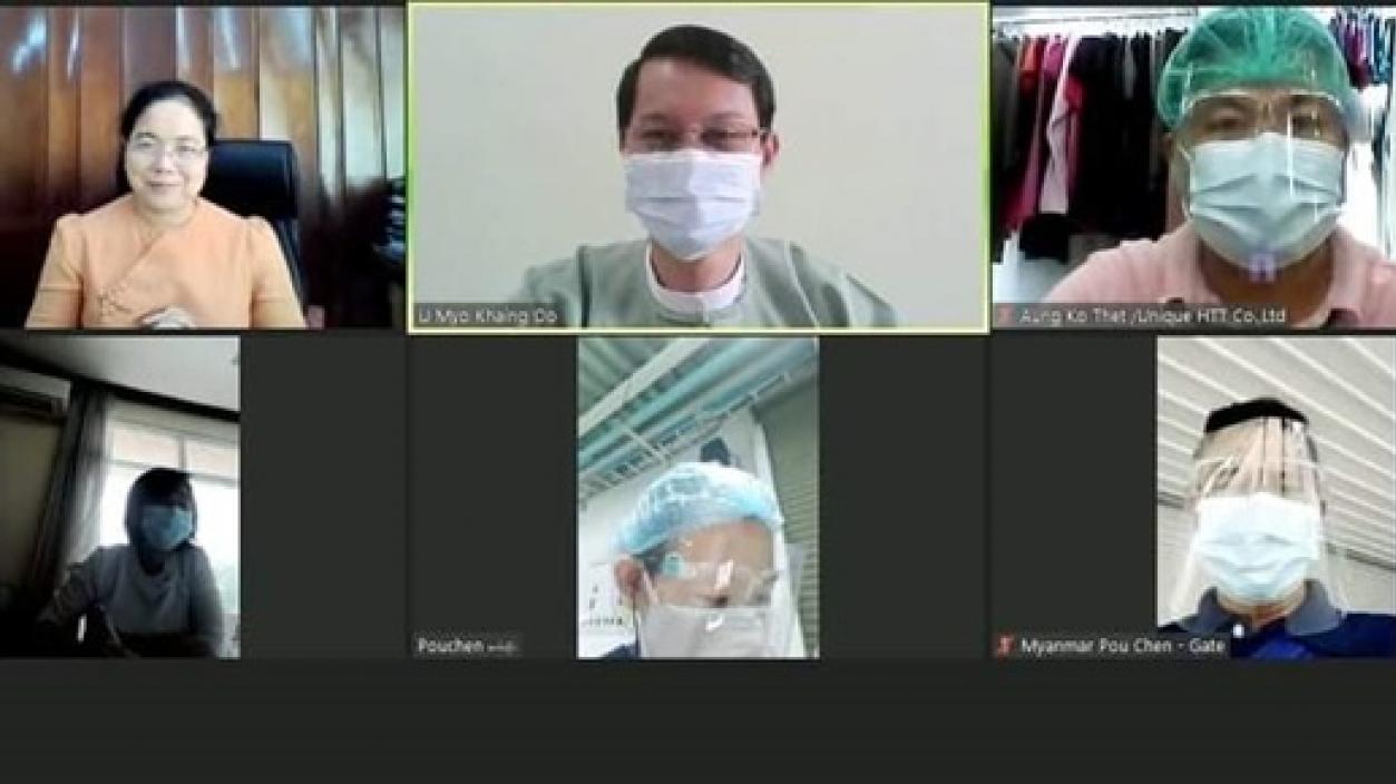 The Yangon Region Investment Monitoring Team met Best Industrial Co., Ltd., New Plus Company Co., Ltd., Shining Access Garment Manufacturing Co., Ltd, Myanmar Pou Chen Co., Ltd and Unique H T T Co., Ltd. using video conferencing system on 19th October, 2020 and checked a factory’s implementations according to the guidelines and procedures for factories of prevention of the corona Virus Disease 2019 (COVID-19) of Ministry of Health and Sports. The team also inspected office Production Lines and employees’ conditions and necessary services to the factory.