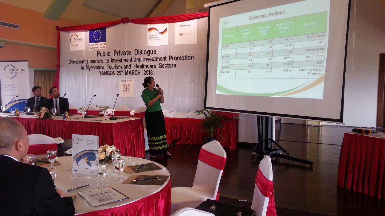 Dr. Marlar Myo Nyunt, Deputy Director General, Directorate of Investment and Company Administration (DICA), Ministry of Planning and Finance attended the Public Private Dialogue Event on Barriers to Investment and Investment Promotion in Myanmar’s Tourism and Healthcare Sectors at Rose Garden Hotel in Yangon on 29th March, 2018 and made a presentation on the title of Current Trends and Outlook of Investment in Myanmar.