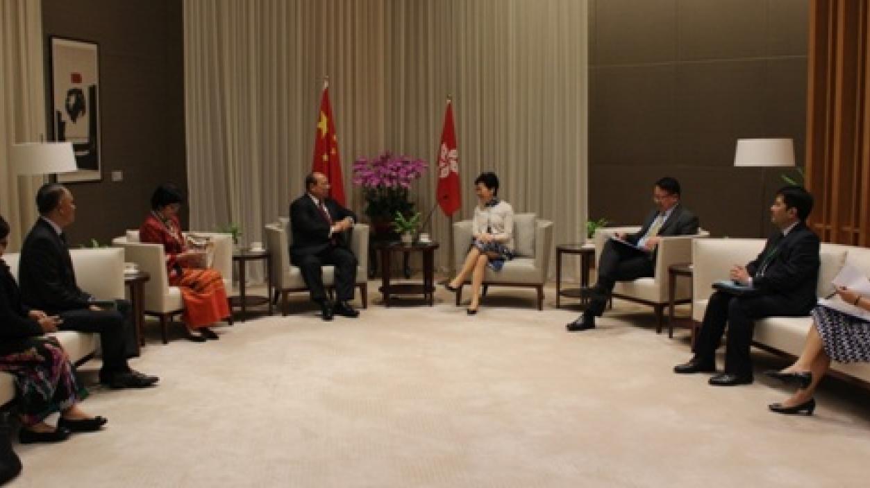 Myanmar delegation led by Union Minister for the Ministry of the Office of the Union Government and the Chairman of Myanmar Investment Commission H.E. U Thaung Tun, who will attend the 23rd Macao International Trade and Investment Fair (IMF) in Macao, called on Chief Executive of the Hong Kong Special Administrative Region, Mrs. Carrie Lam Cheng Yuet-ngor on 16th October, 2018 in Hong Kong and discussed matters relating to promotion of investment and tourism sector, social rescue expertise and experiences on natural disaster, civil servant training on administration and city management, infrastructure development, capacity building and vocational education.
