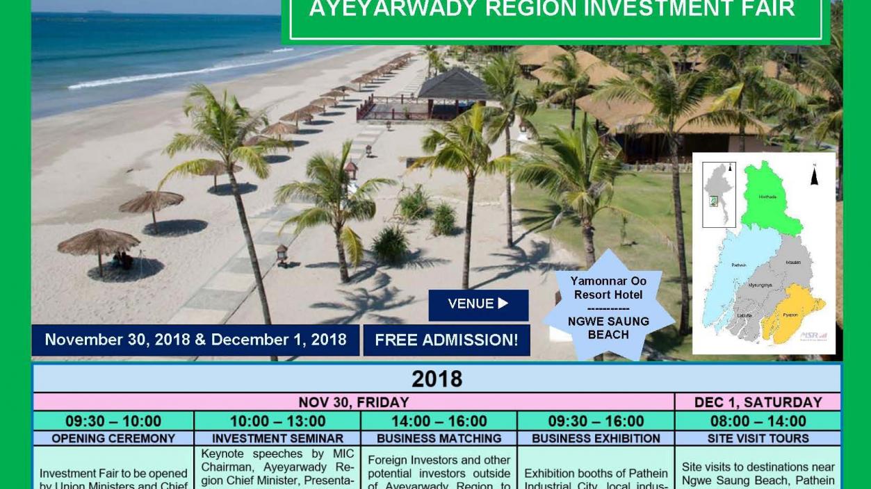 Ayeyarwady Region Investment Fair Flyer is available here! The Fair will be held on 30th November 2018 at Yamonnar Oo Hotel, Ngwe Saung Beach in Ayeyarwady Region.