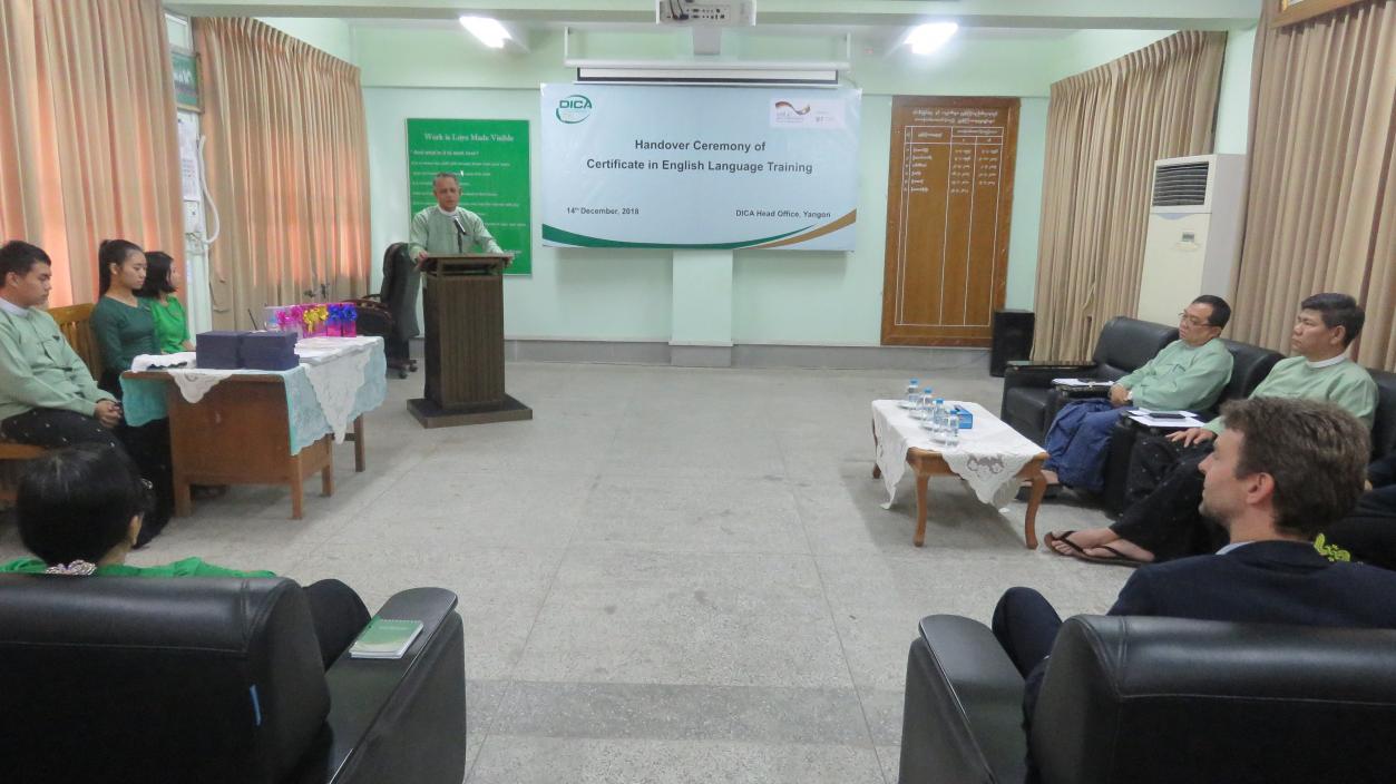 The Certificate Awarding Ceremony for English Language Course was held at the DICA head office in Yangon on 14th December 2018. U Aung Naing Oo, Director General for the Directorate of Investment and Company Administration, Deputy Directors General, Mr. Steffen Grammling, Head of project from GIZ Myanmar, representatives from EDULINK awarded the prizes for the outstanding students and completion certificate for the trainees. Fifty five people were present at ceremony.