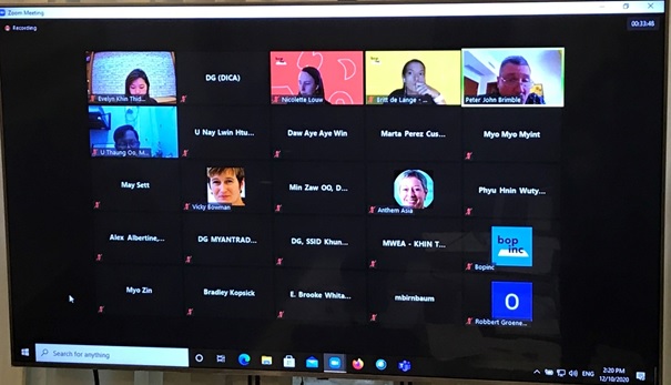 A virtual event on the 6th Meeting of the Inclusive Business/Impact Investing Steering Group organized by the DaNa Facility was held at 2:00 pm on 10th December 2020. The meeting was attended by a total of 27 participants notably U Thant Sin Lwin, Director General of the Directorate of Investment and Company Administration (DICA), Daw Aye Aye Win, Director General of the Directorate of Industrial Supervision and Inspection under the Ministry of Planning, Finance and Industry, U Khon Aye Naing, Director General of Small-Scale Industries Department, Daw Naw Mutakapaw, Director General of the Myanmar Trade Promotion Organization, Deputy Director General U Min Zaw Oo and Officials from DICA and members of the Inclusive Business/Impact Investing Steering Group.