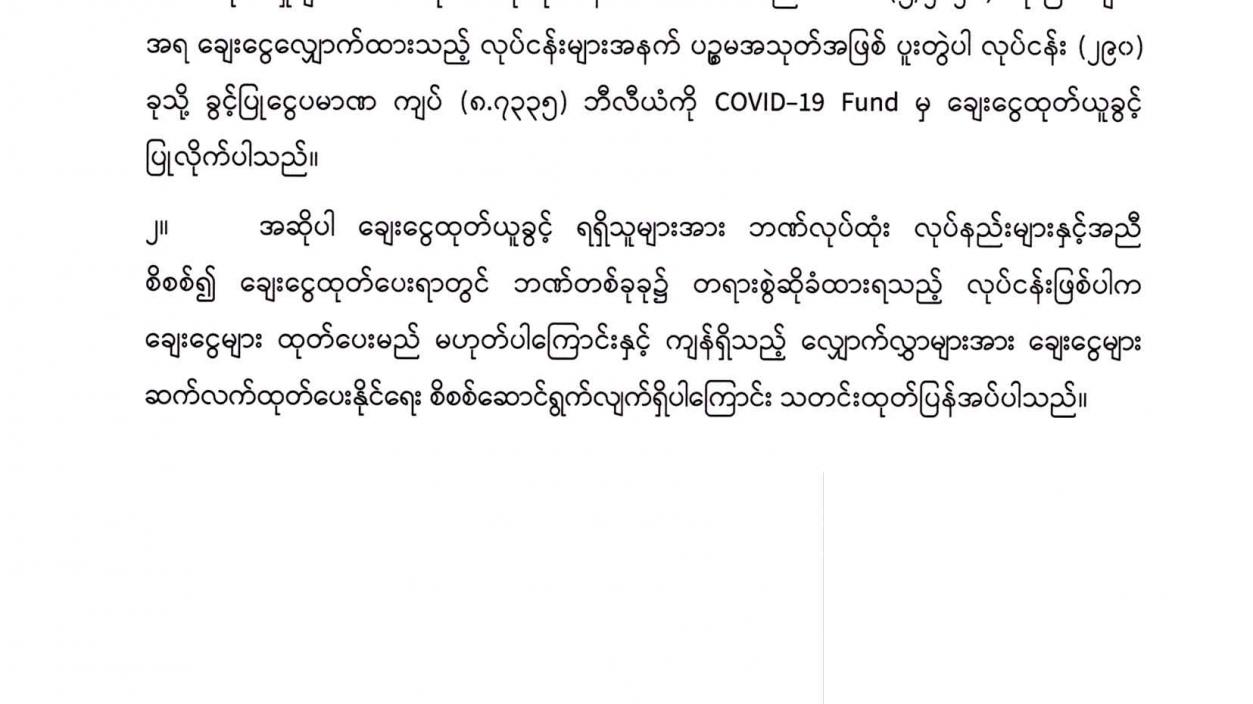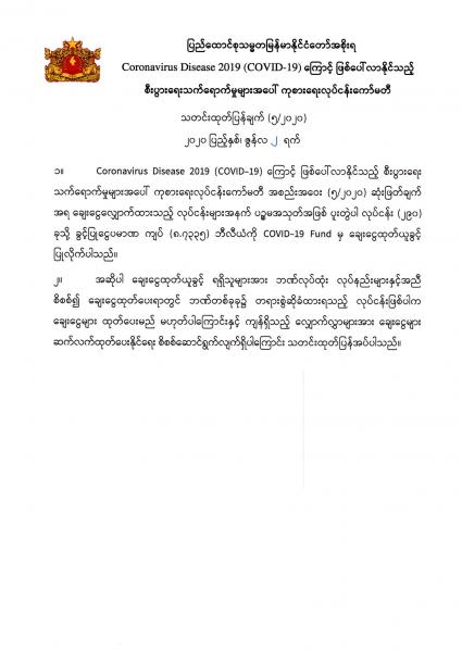 ၁။ Coronavirus Disease 2019 (COVID-19) ကြောင့်ဖြစ်ပေါ်လာနိုင်သည့်စီးပွားရေးသက်ရောက်မှုများအပေါ်ကုစားရေးလုပ်ငန်းကော်မတီအစည်းအဝေး (၅/၂၀၂၀) ဆုံးဖြတ်ချက် အရ ချေးငွေလျှောက်ထားသည့် လုပ်ငန်းများအနက် ပဉ္စမအသုတ်အဖြစ် ပူးတွဲပါလုပ်ငန်း (၂၉၀) ခုသို့ခွင့်ပြုငွေပမာဏကျပ်(၈.၇၃၃၅)ဘီလီယံကိုCOVID-19 Fund မှချေးငွေထုတ်ယူခွင့်ပြုလိုက် ပါသည်။