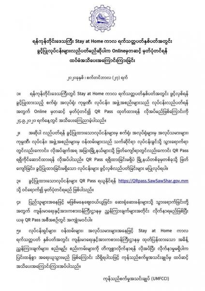 ၁။ ရန်ကုန်တိုင်းဒေသကြီးတွင် Stay at Home ကာလ ရက်သတ္တပတ်နှစ်ပတ်အတွင်း ဖွင့်လှစ်ရန် ခွင့်ပြုထားသည့် စက်ရုံ၊ အလုပ်ရုံ၊ ကုမ္ပဏီ၊ လုပ်ငန်း၊ အဖွဲ့အစည်းများသည် လုပ်ငန်းလည်ပတ်ရန် အတွက် Online မှတဆင့် မှတ်ပုံတင်၍ QR Pass ထုတ်ထားရန် လိုအပ်မည်ဖြစ်ကြောင်းကို ၂၄.၉.၂၀၂၀ ရက်နေ့တွင် အသိပေးကြေညာခဲ့ပါသည်။