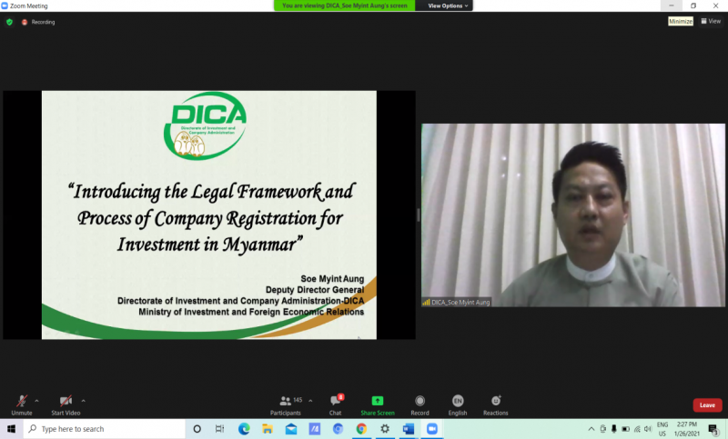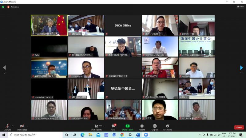 U Thant Sin Lwin, Director General of Directorate of Investment and Company Administration (DICA), Ministry of Investment and Foreign Economic Relations delivered keynote speech today at “Matchmaking Conference on China (Hubei)-Myanmar Investment Cooperation Promotion”, virtually organized with the cooperation between Union of Myanmar Federation of Chamber of Commerce and Industry (UMFCCI) and the Department of Commerce of Hubei Province, People’s Republic of China.