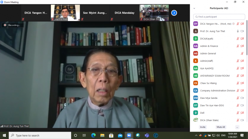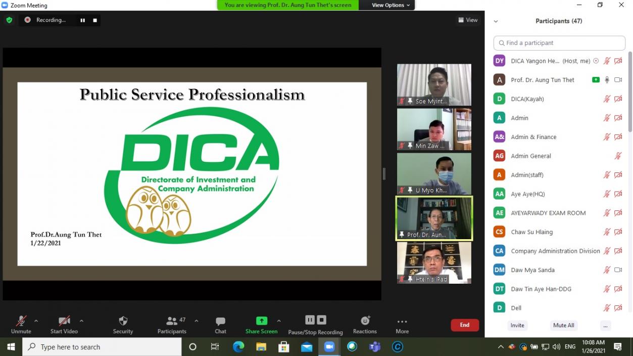 DICA held the webinar of “Professionalism in Public Service” with the aim to enhance the proficient in public service of DICA’s staff by Prof. Dr. Aung Tun Thet, Member of Myanmar Investment Commission on 26th January 2021. At the webinar, members of Myanmar Investment Commission, Deputy Director Generals and DICA officials cordially discussed about public administration and public services. About 115 officials from head office and regions and states also attended the webinar.