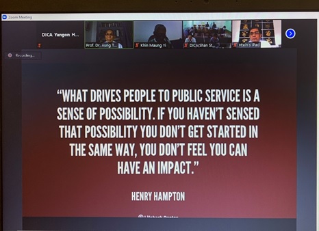 Directorate of Investment and Company Administration-DICA held the webinar for the DICA officials under the title of “New Public Administration” with the aim to enhance the knowledge about public administration of DICA’s staff by Prof. Dr. Aung Tun Thet, Member of Myanmar Investment Commission on 14th January 2021. At the webinar, members of the Myanmar Investment Commission, Deputy Director Generals and DICA officials cordially discussed public administration and public services. About 100 officials from head office and regions and states also attended the webinar.