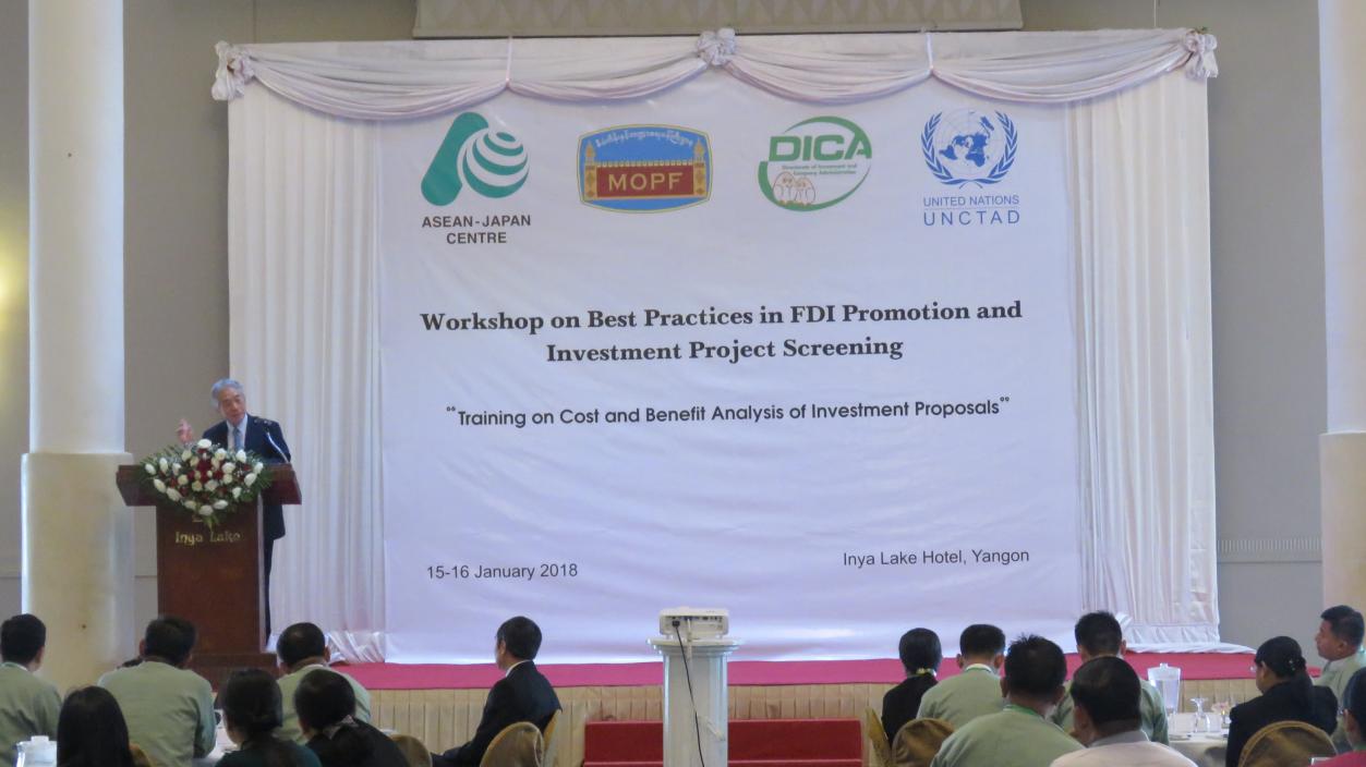 The opening ceremony of the training on Cost and Benefit Analysis of Investment Proposals with the financial assistance of ASEAN Japan Center (AJC) as ASEAN National Activities for 2017 and technical assistance of United Nations Conference on Trade and Development (UNCTAD) was held at the Inya Lake Hotel, Yangon on 15th  January 2018 and it will be continued to 16th January 2018 as the two day event.The training aims to motivate the capacities of the DICA officials in evaluation and appraisal of investment projects to be beneficial investment for the country.