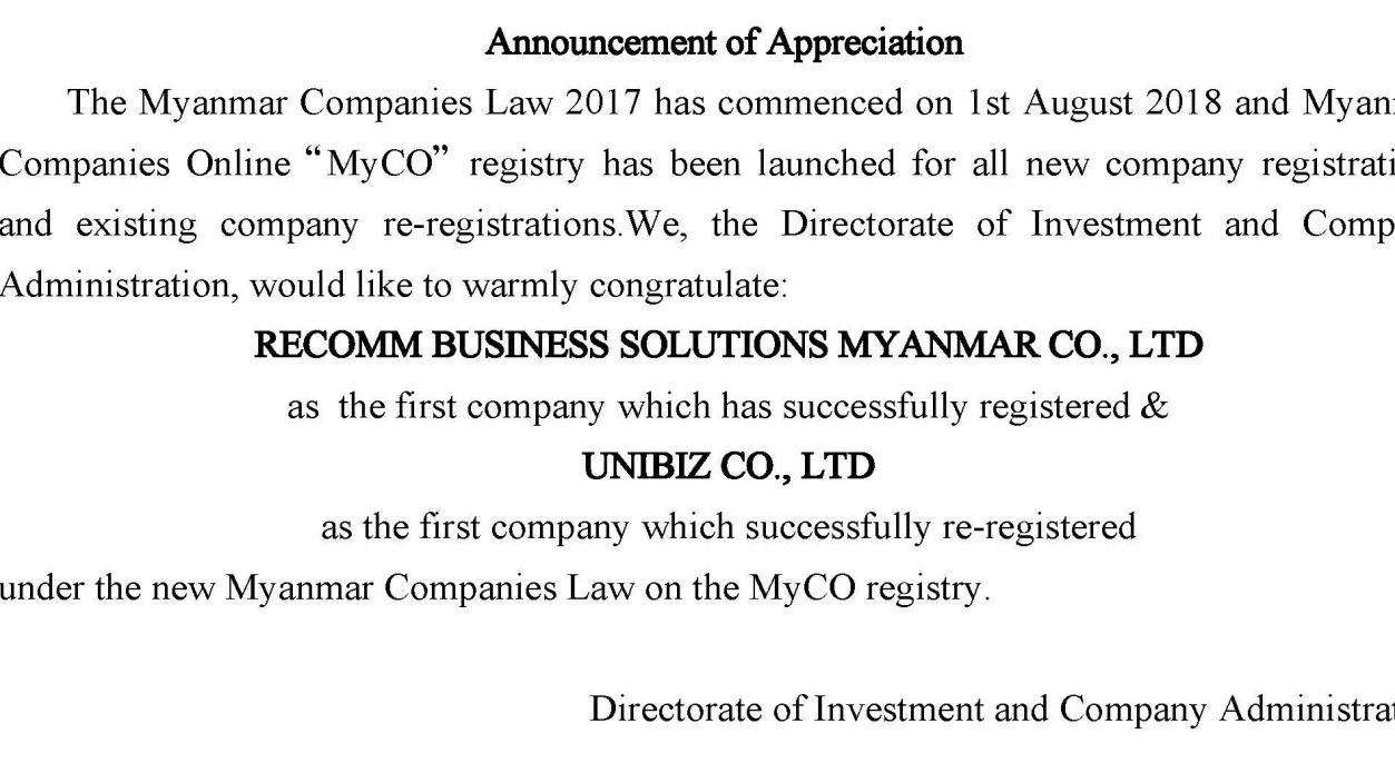 The Myanmar Companies Law 2017 has commenced on 1st August 2018 and Myanmar Companies Online “MyCO” registry has been launched for all new company registrations and existing company re-registrations.We, the Directorate of Investment and Company Administration, would like to warmly congratulate: