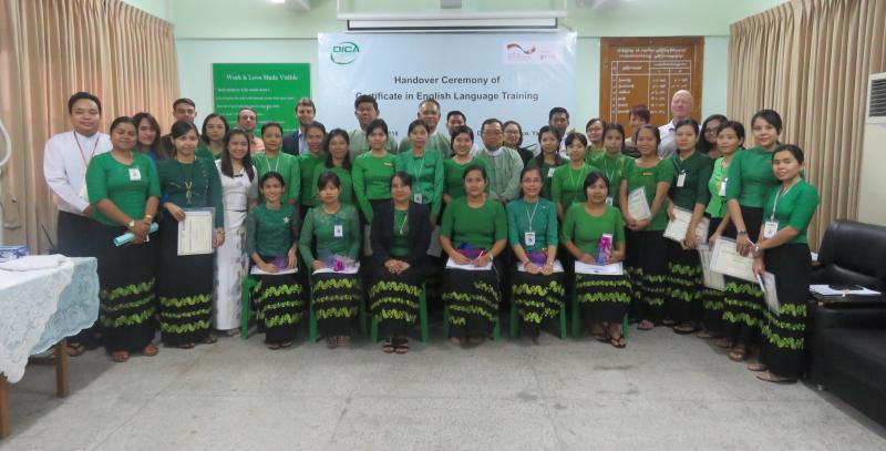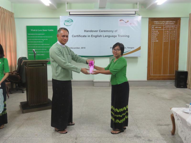 The Certificate Awarding Ceremony for English Language Course was held at the DICA head office in Yangon on 14th December 2018. U Aung Naing Oo, Director General for the Directorate of Investment and Company Administration, Deputy Directors General, Mr. Steffen Grammling, Head of project from GIZ Myanmar, representatives from EDULINK awarded the prizes for the outstanding students and completion certificate for the trainees. Fifty five people were present at ceremony.