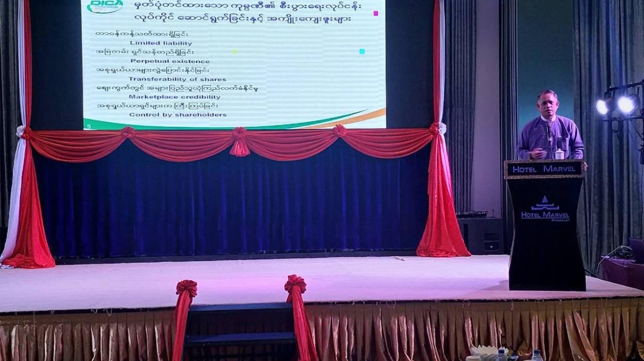 At the seminar, U Aung Naing Oo, Director General of Directorate of Investment and Company Administration (DICA) made a presentation the important facts for a company from Myanmar Companies Law 2017 as a speaker.