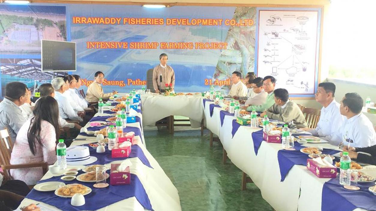 The responsible persons from Yuzana Cold Storage Factory explained the progress of current Shrimp Farming, The process of cold storage, monthly export status, international market situation, and expand their production capacity and the Union Minister urged to use international technology and to promote export.