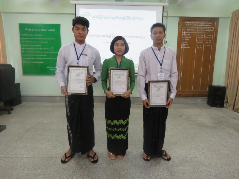 U Aung Naing Oo, Director General, attended the closing ceremony and delivered a speech. After that U Aung Naing Oo awarded prizes to the first prize winner U Than Zaw Aung(Upper Clerk, Investment Division 4), the second prize winner Daw May Zin Oo (Deputy Staff Officer, Bago Region Branch Office) and the third prize winner U Myo Min Thu (Driver 5, Mandalay Region Branch Office). Dr. Malar Myo Nyunt, Deputy Director General, and Dr. Lwin Thuzar Shwe, Director of Human Resource Department and Research Devision gave certificates to each trainee. After that the U Than Zaw Aung, the first prize winner, gave a thank-you note on behalf of all trainees. The ceremony was attended by 55 staff including Director General, Deputy Director Generals, Directors, Deputy Directors and 20 trainees.