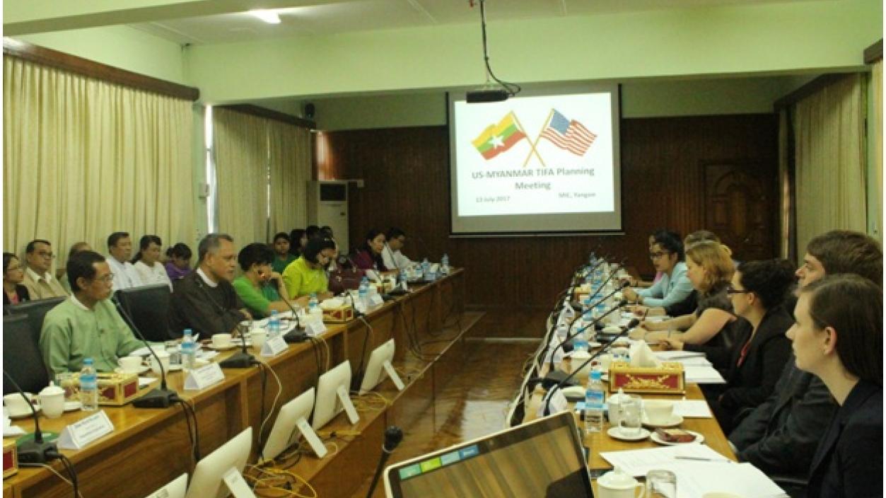အမေရိကန်-မြန်မာ ကုန်သွယ်မှုနှင့်ရင်းနှီးမြှုပ်နှံမှုဆိုင်ရာ မူဘောင်သဘောတူစာချုပ်အပေါ် ဆက်လက်ဆောင်ရွက်မည့် လုပ်ငန်းစဉ်များ ချမှတ်ရေးဆိုင်ရာ အစည်းအဝေးအား မြန်မာနိုင်ငံ ရင်းနှီးမြှုပ်နှံမှုကော်မရှင်ရုံးတွင် ၂၀၁၇ ခုနှစ်၊ ဇူလိုင်လ ၁၃ ရက်နေ့၌ ကျင်းပပြုလုပ်ခဲ့ပါသည်။