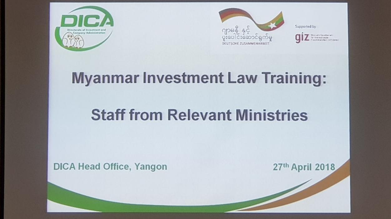 ရင်းနှီးမြှုပ်နှံမှုနှင့် ကုမ္ပဏီများညွှန်ကြားမှု ဦးစီးဌာနမှ ဦးဆောင်၍ ဂျာမဏီ အပြည်ပြည်ဆိုင်ရာ ပူးပေါင်းဆောင်ရွက်ရေးအဖွဲ့ (GIZ)၏ ပံ့ပိုးမှုဖြင့် “မြန်မာနိုင်ငံ ရင်းနှီး မြှုပ်နှံမှု ဥပဒေ၊ နည်းဥပဒေ၊ လုပ်ထုံးလုပ်နည်းများ ရှင်းလင်းဆွေးနွေးခြင်း အခမ်းအနားအား ၂၀၁၈ ခုနှစ် ဧပြီလ ၂၇ ရက် (သောကြာ)နေ့တွင် ရန်ကုန်မြို့၊ ရန်ကင်းမြို့နယ်၊ သစ္စာလမ်း၊ ရင်းနှီးမြှုပ်နှံမှုနှင့်ကုမ္ပဏီများ ညွှန်ကြားမှု ဦးစီးဌာန၌ ကျင်းပခဲ့ရာ ရင်းနှီးမြှုပ်နှံမှုနှင် ကုမ္ပဏီများ ညွှန်ကြားမှုဦးစီးဌာန၊ ဒုတိယညွှန်ကြား ရေးမှူးချုပ်မှ အဖွင့်အမှာစကားနှင့် ရန်ကုန်တိုင်းဒေသကြီး ဦးစီးမှူးမှ အမှာစကား ပြောကြားပေးခဲ့ပြီး တိုင်းဒေသကြီးအဆင့် ဌာနဆိုင်ရာများမှ ကိုယ်စားလှယ်များ စုစုပေါင်း(၂၀)ဦးခန့် တက်ရောက် ဆွေးနွေးခဲ့ကြပါသည်။