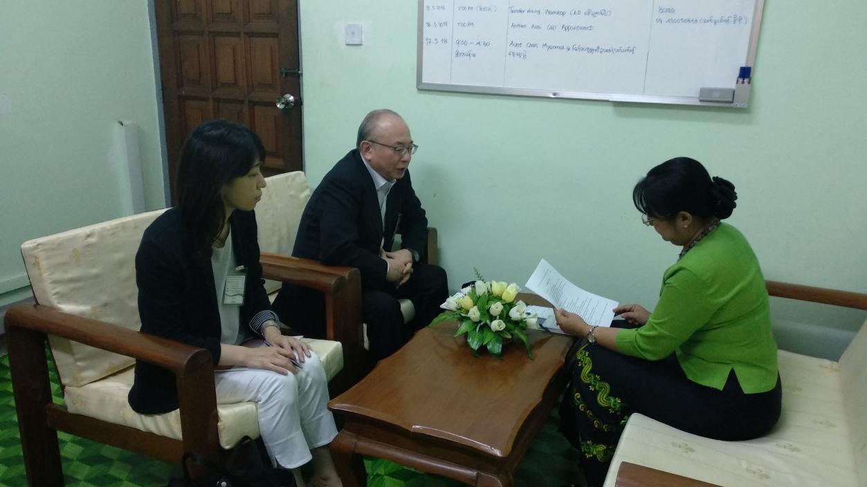 Japan International Cooperation Agency (JICA) ၏ Investment & Trade Promotion Policy မှ အဖွဲ့ခေါင်းဆောင် ဖြစ်သူ Mr. MISHIMA Kazuo နှင့်အဖွဲ့သည် ရင်းနှီးမြှုပ်နှံမှု နှင့် ကုမ္ပဏီများညွှန်ကြားမှုဦးစီးဌာန၊ ဒုတိယညွှန်ကြားရေးမှူးချုပ် ဒေါက်တာမာလာမျိုးညွန့်နှင့် ၂၀၁၈ ခုနှစ် မေလ ၁၆ ရက်နေ့တွင် လာရောက်တွေ့ဆုံပြီး မြန်မာနိုင်ငံ ရင်းနှီးမြှုပ်နှံမှုမြှင့်တင်ရေး နှစ်ရှည် စီမံကိန်းနှင့် စပ်လျဉ်း၍ ဆွေးနွေးခဲ့ကြပါသည်။