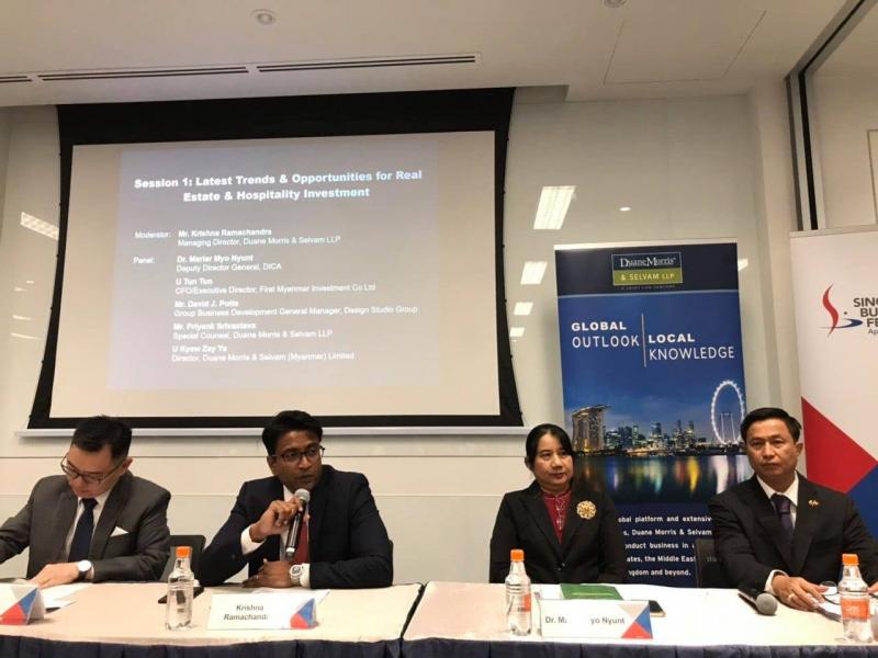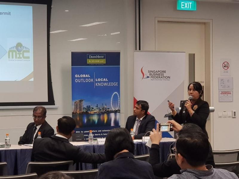 ရင်းနှီးမြှုပ်နှံမှုနှင့်ကုမ္ပဏီများညွှန်ကြားမှုဦးစီးဌာနမှ ဒုတိယညွှန်ကြားရေးမှူးချုပ် ဒေါက်တာမာလာမျိုးညွန့်သည် ၂၀၁၉ ခုနှစ် ဇူလိုင်လ ၄ ရက်နေ့တွင် စင်ကာပူနိုင်ငံ၌ Singapore Business Federation မှကြီးမှူး၍ ကျင်းပပြုလုပ်သည့် Myanmar Market Insights Seminar on the Latest Trends & Opportunities for Real Estate, Hospitality, E-Commerce, Energy & Infrastructure သို့ တက်ရောက်ခဲ့ပါသည်။