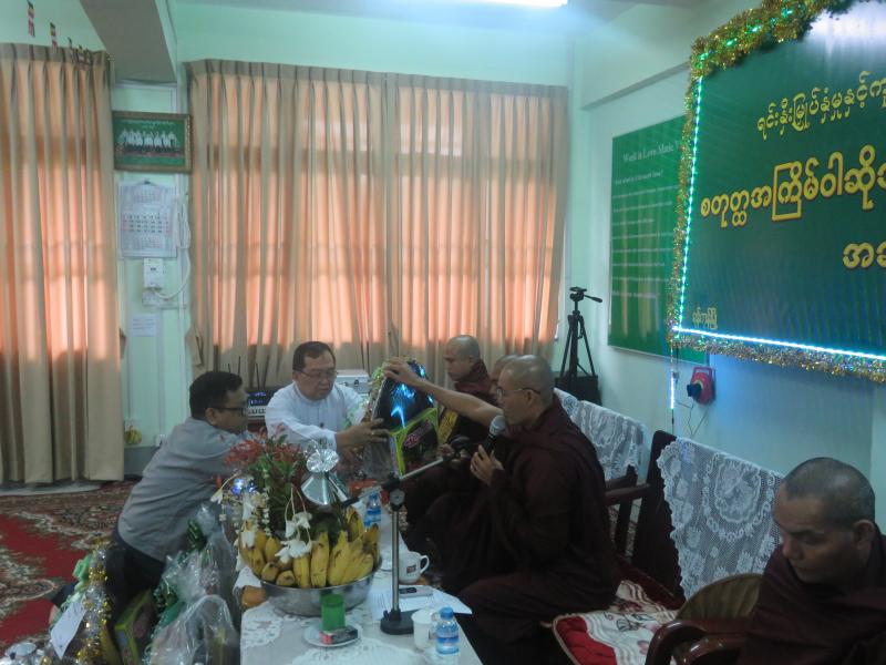 ယင်းနောက် တွဲဖက်အတွင်းရေးမှူး၊ ဒုတိယ ညွှန်ကြားရေးမှူးချုပ် များ နှင့် ညွှန်ကြားရေးမှူးများမှ ဆရာတော်၊ သံဃာတော်များထံ ဝါဆိုသင်္ကန်းနှင့် လှူဖွယ် ဝတ္တု ပစ္စည်းများ ဆက်ကပ် လှူဒါန်း တရားနာယူကြပြီးနောက် လှူဒါန်းမှု အစုစုအတွက် ရေစက်သွန်းချ အမျှပေးဝေ ကြပါသည်။