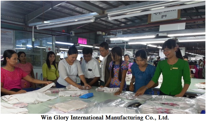 မြန်မာနိုင်ငံရင်းနှီးမြှုပ်နှံမှုကော်မရှင်၏ ခွင့်ပြုမိန့်ဖြင့်ဆောင်ရွက်လျက်ရှိသော လှိုင်သာယာမြို့နယ်၊ ရန်ကုန်တိုင်း ဒေသကြီးရှိ United Knitting (Myanmar) Company Limited, Win Glory International Manufacturing Co., Ltd. နှင့် Star Team Manufacturing Co., Ltd. တို့သို့ ရင်းနှီးမြှုပ်နှံမှုနှင့် ကုမ္ပဏီများညွှန်ကြားမှုဦးစီးဌာန၊ အလုပ်သမားညွှန်ကြားမှုဦးစီးဌာန၊ ပတ်ဝန်းကျင်ထိန်းသိမ်းရေးဦးစီးဌာနနှင့် စက်မှုကြီးကြပ်ရေးနှင့်စစ်ဆေးရေးဦးစီးဌာနတို့မှ တာဝန်ရှိပုဂ္ဂိုလ်များပါဝင်သည့် ကွင်းဆင်းစစ်ဆေးရေး အဖွဲ့သည့် ၂၀၁၆ ခုနှစ်၊ မေလ ၂၅ ရက်နေ့တွင် သွားရောက်စစ်ဆေးပြီး လိုအပ်သည်များကို ပေါင်းစပ် ညှိနှိုင်း ဆောင်ရွက်ပေးခဲ့ပါသည်။