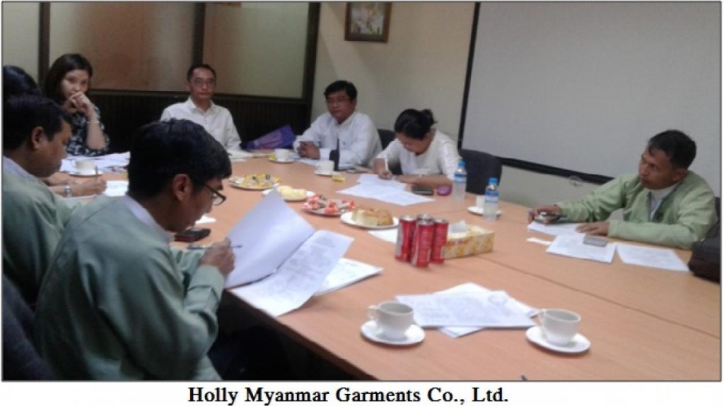 မြန်မာနိုင်ငံရင်းနှီးမြှုပ်နှံမှုကော်မရှင်၏ ခွင့်ပြုမိန့်ဖြင့်ဆောင်ရွက်လျက်ရှိသော ရန်ကုန်တိုင်းဒေသကြီး၊ လှိုင်သာယာမြို့နယ်၊ ရွှေလင်ပန်းစက်မှုဇုန်ရှိ “Holly Myanmar Garments Co., Ltd.”နှင့်“Eslite Garment Co., Ltd.”၊ လှိုင်သာယာစက်မှုဇုန်ရှိ“Saung Hnin Cherry Co., Ltd.”တို့သို့ ရင်းနှီးမြှုပ်နှံမှုနှင့် ကုမ္ပဏီများညွှန်ကြားမှုဦးစီးဌာန၊ အလုပ်သမားညွှန်ကြားမှုဦးစီးဌာန၊ ပတ်ဝန်းကျင် ထိန်းသိမ်းရေးဦးစီးဌာနနှင့် စက်မှုကြီးကြပ်ရေးနှင့်စစ်ဆေးရေးဦးစီးဌာနတို့မှ တာဝန်ရှိပုဂ္ဂိုလ်များပါဝင်သည့် ကွင်းဆင်းစစ်ဆေးရေးအဖွဲ့သည် ၂၀၁၆ ခုနှစ်၊ ဇူလိုင်လ ၂၈ ရက်နေ့တွင် သွားရောက်စစ်ဆေးပြီး လိုအပ်သည်များကို ပေါင်းစပ်ညှိနှိုင်း ဆောင်ရွက်ပေးခဲ့ပါသည်။