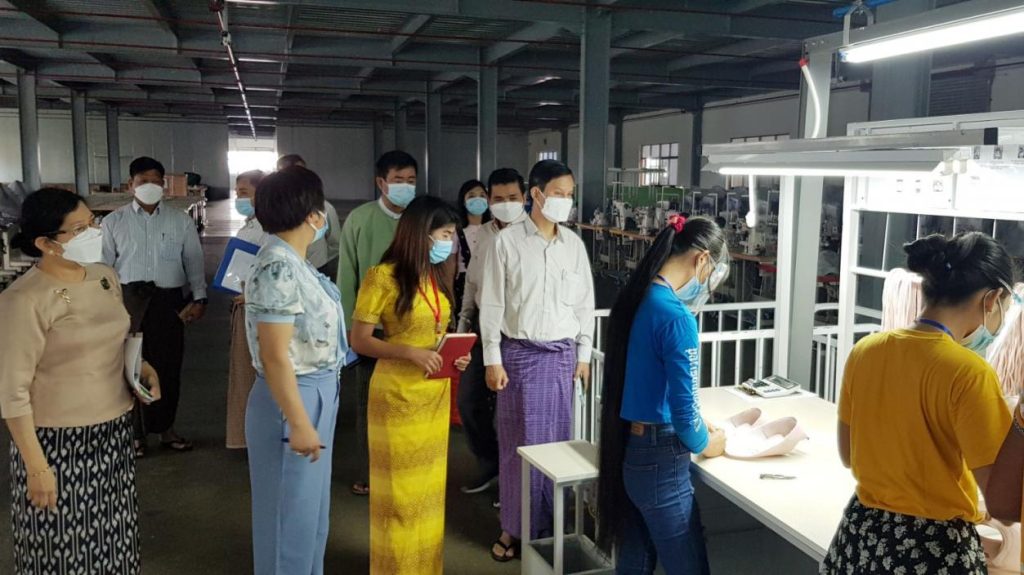 ၂၀၂၁ ခုနှစ်၊ နိုဝင်ဘာလ ၈ ရက်နေ့တွင် ရန်ကုန်တိုင်းဒေသကြီး ရင်းနှီးမြှုပ်နှံမှု လုပ်ငန်းများ ကြီးကြပ်ရေးအဖွဲ့သည် ရန်ကုန်တိုင်းဒေသကြီးအတွင်း CMP စနစ်ဖြင့် ဖိနပ် အမျိုးမျိုးချုပ်လုပ်ခြင်း လုပ်ငန်းနှင့် ခေါက်ဆွဲ၊ ကြာဇံစသည့် ပစ္စည်းများအား အသင့် စားသောက်ကုန်အဖြစ် တန်ဖိုးမြှင့် ထုတ်လုပ်ခြင်းနှင့် ပြည်တွင်းဖြန့်ဖြူးရောင်းချခြင်းလုပ်ငန်း တို့ဆောင်ရွက်လျက်ရှိသော စက်ရုံများသို့ သွားရောက်၍ စီးပွားဖြစ် စတင်လည်ပတ် ထုတ်လုပ်ရန်အတွက် လုပ်ငန်းဆောင်ရွက်နေမှု အခြေအနေ၊ ကိုဗစ်-၁၉ ရောဂါ ကာကွယ် ထိန်းချုပ်ရေးနှင့် ပတ်သက်၍ ကျန်းမာရေး ဝန်ကြီးဌာန၏ လမ်းညွှန်ချက်များ ဖြစ်သည့် စက်ရုံ၊ အလုပ်ရုံများ၊ လုပ်ငန်းခွင်များ၊ အလုပ်ဌာနများတွင် အထူးဂရုပြု လိုက်နာရမည့် အချက်များ (Version 5.0) အား လိုက်နာ ဆောင်ရွက်ထားရှိမှု အခြေအနေတို့ကို သွားရောက် ကြည့်ရှုအားပေးပြီး လိုအပ် သည်များကို ပေါင်းစပ်ညှိနှိုင်း ဆောင်ရွက်ပေးခဲ့ပါသည်။