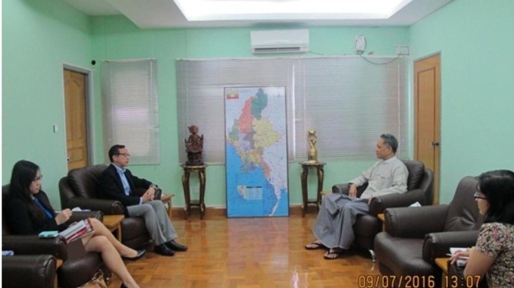 Singapore Institute of International Affairs မှ Chairman ဖြစ်သူ Professor Simaon SC Tay နှင့် Senior Policy Research Analyst ဖြစ်သူ Ms. Melody Au တို့သည် ရင်းနှီးမြှုပ်နှံမှုနှင့် ကုမ္ပဏီများညွှန်ကြားမှု ဦးစီးဌာန၊ အမှတ်(၁)၊ သစ္စာလမ်း၊ ရန်ကင်းမြို့နယ်၊ ရန်ကုန်မြို့၌ (၉-၇-၂၀၁၆) ရက်နေ့ နေ့လည် (၁:၀၀) နာရီတွင် လာရောက်၍ မြန်မာနိုင်ငံနှင့် စင်ကာပူနိုင်ငံအကြား စီးပွားရေးနှင့် ရင်းနှီးမြှုပ်နှံမှု ပူးပေါင်းဆောင်ရွက်မှုဆိုင်ရာ ကိစ္စရပ်များနှင့် စပ်လျဉ်း၍ ရှင်းလင်းဆွေးနွေးခဲ့ကြပါသည်။