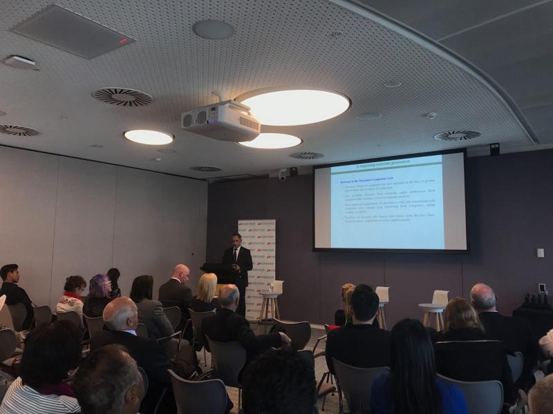 မြန်မာနိုင်ငံ ရင်းနှီးမြှုပ်နှံမှုဥပဒေသစ်အား ရှင်းလင်းပြောကြားရန်နှင့် နှစ်နိုင်ငံ အကြား စီးပွားရေးဆိုင်ရာ ဆက်သွယ်မှုများ တိုးမြှင့်တည်ဆောက်နိုင်ရန် ရည်ရွယ်၍ သြစတြေးလျနိုင်ငံတွင် မဲလ်ဘုန်းမြို့နှင့် ဆစ်ဒနီမြို့တို့၌ ၂၀၁၇ ခုနှစ် ဇူလိုင်လ ၂၆ ရက်နေ့နှင့် ၂၇ ရက်နေ့တို့တွင် အသီးသီး ကျင်းပပြုလုပ်သည့် ရင်းနှီး မြှုပ်နှံမှုဆိုင်ရာ ဆွေးနွေးပွဲများသို့ ရင်းနှီးမြှုပ်နှံမှုနှင့် ကုမ္ပဏီများညွှန်ကြားမှုဦးစီးဌာန ညွှန်ကြားရေးမှူးချုပ်၊ မြန်မာနိုင်ငံ ရင်းနှီးမြှုပ်နှံမှု ကော်မရှင် အတွင်းရေးမှူး ဦးအောင်နိုင်ဦး တက်ရောက်ခဲ့ပါသည်။