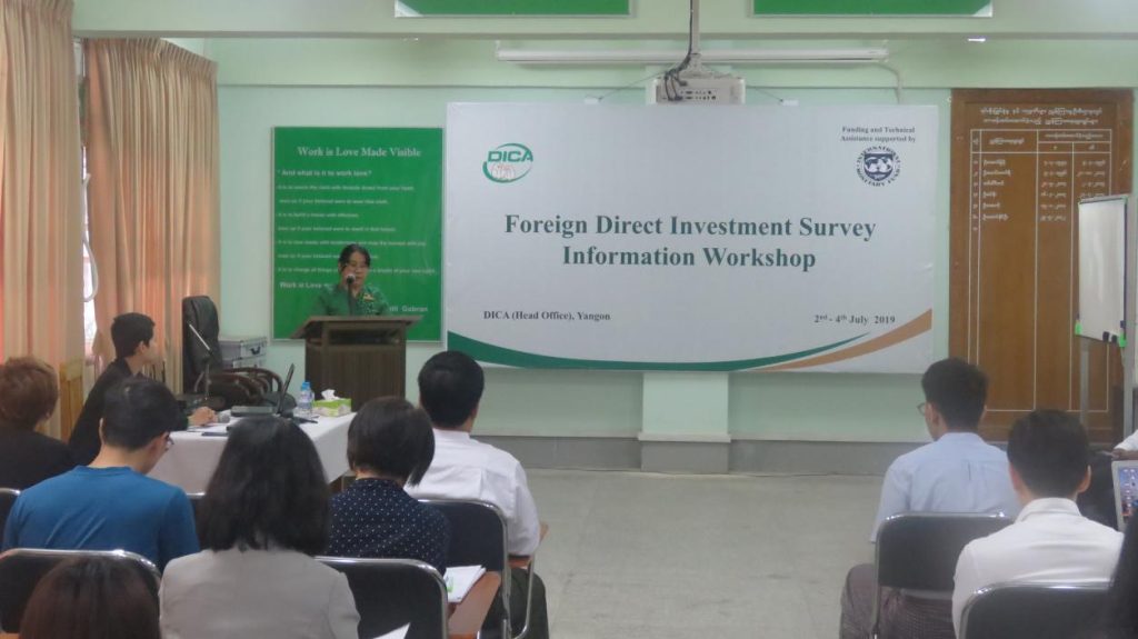 နိုင်ငံခြားတိုက်ရိုက် ရင်းနှီးမြှုပ်နှံမှုသဘောတရားများနှင့် Survey Form ဖြည့်နည်း တို့ကို နားလည်သဘောပေါက်စေရန်အတွက် အပြည်ပြည်ဆိုင်ရာ ငွေကြေးရံပုံငွေအဖွဲ့၏ နည်းပညာအထောက်အပံ့ဖြင့် နိုင်ငံခြားတိုက်ရိုက်ရင်းနှီးမြှုပ်နှံမှု စာရင်းအင်းဆိုင်ရာ အလုပ်ရုံ ဆွေးနွေးပွဲကို ၂၀၁၉ ခုနှစ် ဇူလိုင်လ ၂ ရက်နေ့တွင် ရင်းနှီးမြှုပ်နှံမှုနှင့်ကုမ္ပဏီများ ညွှန်ကြားမှု ဦးစီးဌာန၌ စတင် ကျင်းပခဲ့ပါသည်။