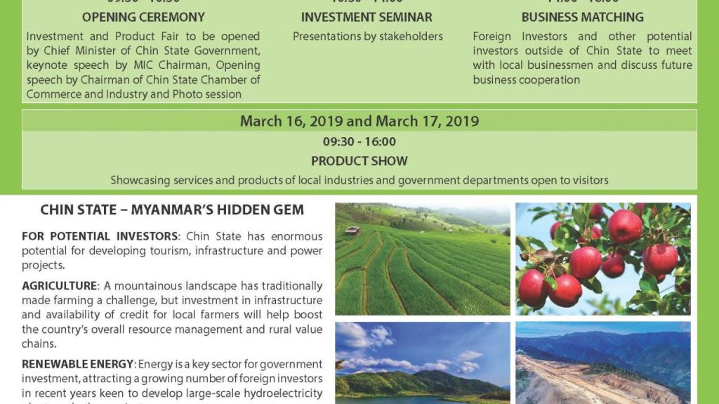 ချင်းပြည်နယ်၏ ရင်းနှီးမြှုပ်နှံမှု နှင့် ဒေသထွက်ကုန်များအား မြှင့်တင်ရန် အတွက် ၂၀၁၉ ခုနှစ် မတ်လ ၁၆ ရက်နေ့နှင့် ၁၇ ရက်နေ့တို့တွင် ရန်ကုန်မြို့ရှိ Myanmar Convention Centre ၌ ကျင်းပ ပြုလုပ်မည့် Chin State Investment and Product Fair ကို တက်ရောက်နိုင်ပါရန် ဖိတ်ခေါ်အပ်ပါသည်။