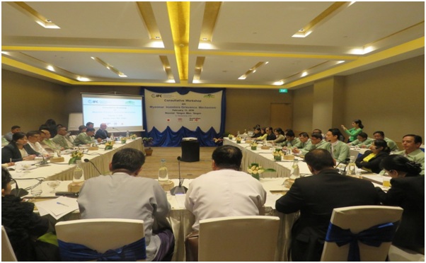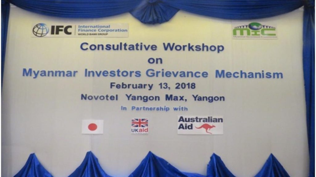 မြန်မာနိုင်ငံရင်းနှီးမြှုပ်နှံမှုကော်မရှင်နှင့် International Finance Corporation တို့ပူးပေါင်း၍ Myanmar Investors Grievance Mechanism အလုပ်ရုံဆွေးနွေးပွဲ ကို ၂၀၁၈ ခုနှစ်ဖေဖော်ဝါရီလ ၁၃ ရက်နေ့တွင် ရန်ကုန်မြို့ရှိ Novotel Hotel Max တွင် ကျင်းပပြုလုပ်ခဲ့ပါသည်။ အဆိုပါ အလုပ်ရုံ ဆွေးနွေးပွဲကို ရင်းနှီးမြှုပ်နှံမှုဆိုင်ရာ ပြဿနာရပ်များအား တရားဝင်အငြင်းပွားမှုအဆင့်သို့ မရောက်ရှိမီ ရင်းနှီးမြှုပ်နှံသူများ၏ အခက်အခဲများ၊ နစ်နာမှုများနှင့် ပဋိပက္ခများကိုဖြေရှင်းနိုင်ရန် နစ်နာမှုဖြေရှင်း သည့် နည်းလမ်းများချမှတ်နိုင်ရန် ရည်ရွယ်၍ ကျင်းပပြုလုပ်ခြင်းဖြစ်ပါသည်။