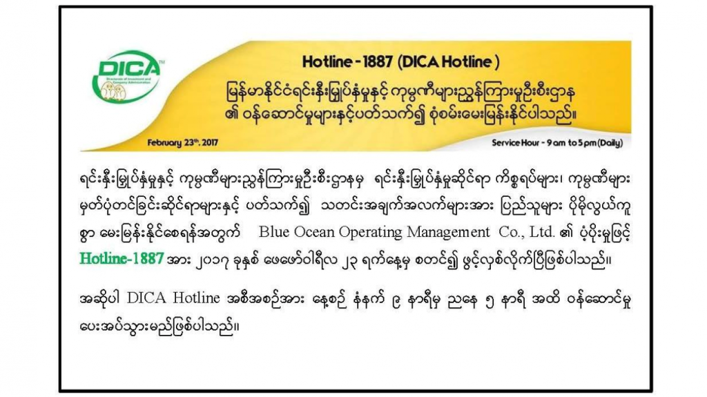 ရင်းနှီးမြှုပ်နှံမှုနှင့် ကုမ္ပဏီများညွှန်ကြားမှု ဦးစီးဌာနမှ ရင်းနှီးမြှုပ်နှံမှုဆိုင်ရာ ကိစ္စရပ်များ၊ ကုမ္ပဏီများမှတ်ပုံတင်ခြင်းဆိုင်ရာများနှင့် ပတ်သက်၍ သတင်း အချက်အလက် များအား ပြည်သူ များ ပိုမိုလွယ်ကူစွာ မေးမြန်းနိုင်စေရန်အတွက် Blue Ocean Operating Management Co., Ltd. ၏ ပံ့ပိုးမှုဖြင့် Hotline 1887 အား ၂၀၁၇ ခုနှစ် ဖေဖော်ဝါရီလ ၂၃ ရက်နေ့မှ စတင်၍ ဖွင့်လှစ် လိုက်ပြီဖြစ်ပါသည်။