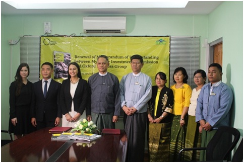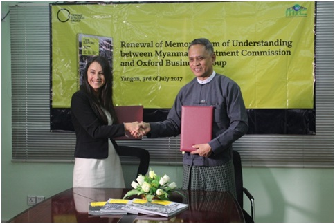 မြန်မာနိုင်ငံနှင့် အောက်စ်ဖို့ဒ် စီးပွားရေးလုပ်ငန်းအုပ်စုတို့အကြား ပူးပေါင်းဆောင်ရွက်မှု ခိုင်မာမှု ရှိစေရန် ရည်ရွယ်၍ မြန်မာနိုင်ငံရင်းနှီးမြှုပ်နှံမှုကော်မရှင်နှင့် အောက်စ်ဖို့ဒ်စီးပွားရေး လုပ်ငန်းအုပ်စု တို့သည် ၂၀၁၈၊ ၂၀၁၉ နှင့် ၂၀၂၀ ခုနှစ်များအတွက် OBG ၏ မြန်မာနိုင်ငံ ဆိုင်ရာ အစီရင်ခံစာများကို နှစ်အလိုက် ထုတ်ဝေနိုင်ရန် သုတေသန အစုစပ်လုပ်ငန်း သဘောတူစာချုပ် (Research Partnership Agreement)ကို ၂၀၁၇ ခုနှစ်၊ ဇူလိုင်လ ၃ ရက်နေ့တွင် အမှတ်(၁)၊ သစ္စာလမ်း၊ ရန်ကင်းမြို့နယ်၊ ရန်ကုန်မြို့ရှိ ရင်းနှီးမြှုပ်နှံမှုနှင့် ကုမ္ပဏီများညွှန်ကြားမှုဦးစီးဌာနရုံး၌ နှစ်ဖက်သဘောတူ လက်မှတ်ရေးထိုးချုပ်ဆိုခဲ့ကြ ပါသည်။