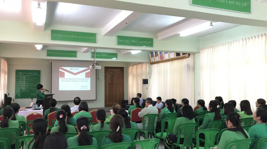 A Balance Approach for Strengthening Responsible Investments in Myanmar ၊ The 2nd OECD Investment Policy Review of Myanmar (Draft) ပါ Promoting and Enabling Responsible Business Conducts နှင့် Investment Framework for Green Growth တို့နှင့် စပ်လျဉ်းသည့် ဌာနတွင်းဆွေးနွေးပွဲတစ်ရပ်ကို ၂၀၂၀ ပြည့်နှစ် မတ်လ ၅ ရက်နေ့တွင် ရင်းနှီးမြှုပ်နှံမှုနှင့် ကုမ္ပဏီများညွှန်ကြားမှု ဦးစီးဌာန(ရုံးချုပ်)၌ ကျင်းပပြုလုပ်ခဲ့ပါသည်။ ဆွေးနွေးပွဲပါ အကြောင်းအရာ များအား ရင်းနှီးမြှုပ်နှံမှုနှင့် ကုမ္ပဏီများညွှန်ကြားမှု ဦးစီးဌာနမှ လက်ထောက်ညွှန်ကြားရေးမှူး ဒေါ်ရီတာထွန်းမြင့်က ရှင်းလင်းဆွေးနွေးခဲ့ပြီး တက်ရောက်လာသူများမှလည်း ပါဝင်ဆွေးနွေးခဲ့ကြပါ သည်။ အဆိုပါဆွေးနွေးပွဲသို့ ရင်းနှီးမြှုပ်နှံမှုနှင့် ကုမ္ပဏီများညွှန်ကြားမှုဦးစီးဌာနမှ ဝန်ထမ်းစုစုပေါင်း ၆၀ ဦးခန့် တက်ရောက်ခဲ့ပါသည်။