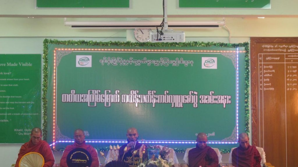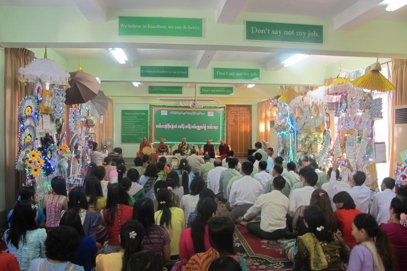 ထို့နောက် မဟာဘုံကထိန် အလှူတော် မင်္ဂလာအခမ်းအနားကို ကျင်းပရာ သုခိတာရာမ (ယဉ်ငေး)ကျောင်း ပရိယတ္တိ-ပဋိပတ္တိ၊ ယဉ်ကျေးလိမ္မာသာသနာပြုဆရာတော် ဦးက္ကုန္ဒက ထံမှ ညွှန်ကြားရေးမှူးချုပ် အမှူးပြုသော ပရိသတ်များက ငါးပါးသီလ ခံယူ ဆောက်တည်ကြပြီး ပရိတ်တရားတော်များ နာကြားကြပါသည်။
