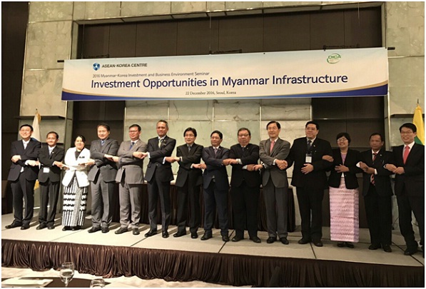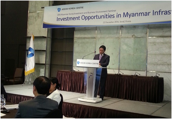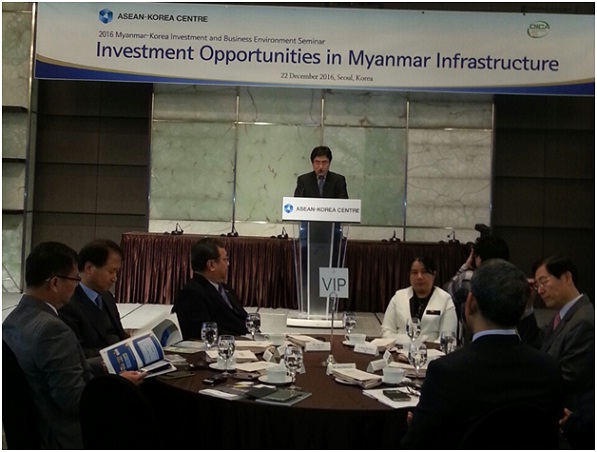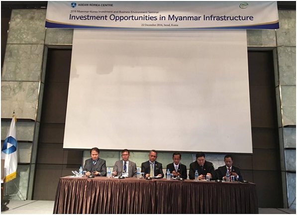 မြန်မာနိုင်ငံနှင့် ကိုရီးယားသမ္မတနိုင်ငံတို့အကြား စီးပွားရေးဆိုင်ရာ အပြန်အလှန် ပူးပေါင်း ဆောင်ရွက်မှုများ ပိုမိုချောမွေ့စေရန်၊ မြန်မာနိုင်ငံ၏ အခြေခံအဆောက်အဦနှင့် စွမ်းအင်ကဏ္ဍတို့၏ အလားအလာကောင်းများကို သိရှိစေနိုင်ရန်အတွက် ကိုရီးယားသမ္မတ နိုင်ငံ၊ ဆိုလ်းမြို့တွင် မြန်မာနိုင်ငံ၏ ရင်းနှီးမြှုပ်နှံမှုနှင့် စီးပွားရေးဝန်းကျင်ဆိုင်ရာ ဆွေးနွေးပွဲကို ၂၀၁၆ ခုနှစ် ဒီဇင်ဘာလ ၂၂ ရက် နေ့တွင် ဆိုးလ်မြို့ Plaza Hotel, Diamond Hall ၌ ကျင်းပပြုလုပ်ခဲ့ပါသည်။