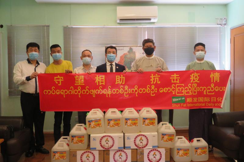 CHINA-MYANMAR Economic Cooperation and Development Promotion Association နှင့် Shun Fa International Daily Chemicals (Myanmar) Co.,Ltd တို့သည် မြန်မာနိုင်ငံ ရင်းနှီးမြှုပ်နှံမှုကော်မရှင်သို့ Covid-19 ဗိုင်းရပ်စ်ရောဂါကာကွယ်ရေးအတွက် လက်သန့်ဆေးရည် များကို ၂၀၂၀ ပြည့်နှစ် စက်တင်ဘာလ ၃ ရက်နေ့ တွင် လှူဒါန်းခဲ့ရာ မြန်မာနိုင်ငံရင်းနှီးမြှုပ်နှံမှုကော်မရှင် အတွင်းရေးမှူး ဉီးသန့်စင်လွင်က လက်ခံရယူ၍ ကျေးဇူး တင်စကား ပြန်လည်ပြောကြားခဲ့ပါသည်။