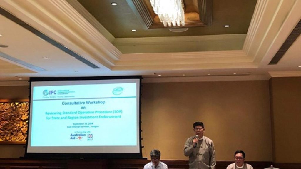 ရင်းနှီးမြှုပ်နှံမှုနှင့် နိုင်ငံခြားစီးပွား ဆက်သွယ်ရေး ဝန်ကြီးဌာန၊ ရင်းနှီးမြှုပ်နှံမှုနှင့် ကုမ္ပဏီများ ညွှန်ကြားမှုဦးစီးဌာနနှင့် International Finance Corporation (IFC)တို့ ပူးပေါင်း၍ တိုင်းဒေသကြီး/ ပြည်နယ်ရင်းနှီးမြှုပ်နှံမှု အတည်ပြုမိန့်အတွက် စံချိန်စံညွှန်းမီလုပ်ထုံးလုပ်နည်းများဆိုင်ရာအလုပ်ရုံ ဆွေးနွေးပွဲကို ၂၀၁၉ ခုနှစ် စက်တင်ဘာလ ၂၆ ရက်နေ့တွင် ရန်ကုန်မြို့ရှိSule Shangrila ဟိုတယ်၌ ကျင်းပပြုလုပ်ခဲ့ပါသည်။