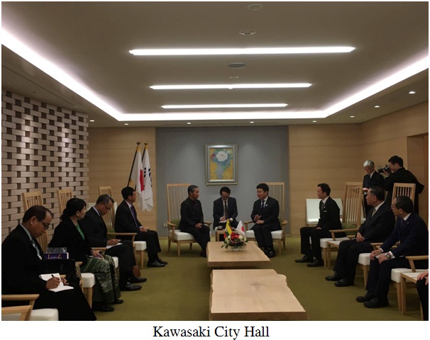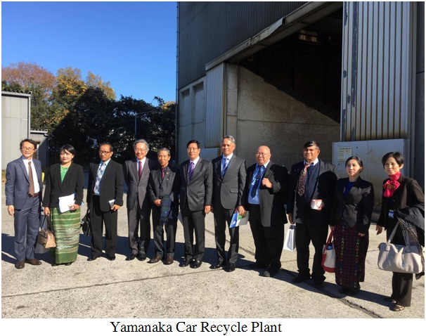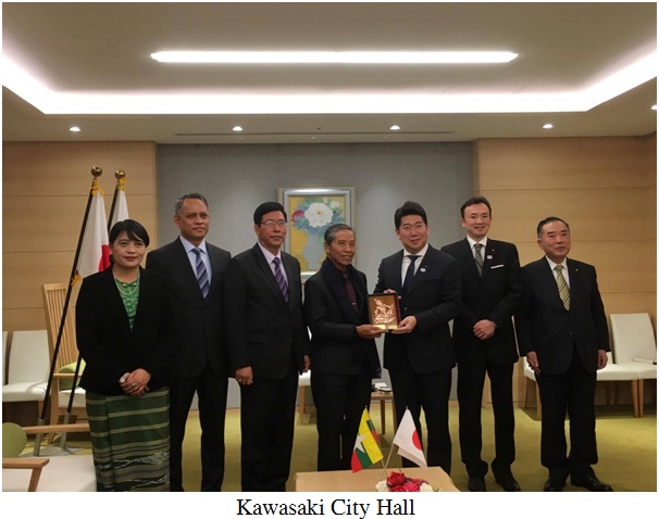 မြန်မာနိုင်ငံရင်းနှီးမြှုပ်နှံမှုကော်မရှင် ဥက္ကဋ္ဌ၊ စီမံကိန်းနှင့် ဘဏ္ဍာရေးဝန်ကြီးဌာန ပြည်ထောင်စုဝန်ကြီး ဦးကျော်ဝင်း ဦးဆောင်သော ကိုယ်စားလှယ် အဖွဲ့သည် ၂၀၁၆ ခုနှစ် ဒီဇင်ဘာလ ၇ ရက်နေ့မှ ၉ ရက်နေ့အထိ ဂျပန်နိုင်ငံ၊ တိုကျိုမြို့တွင် ကျင်းပသည့် မြန်မာနိုင်ငံ ရင်းနှီးမြှုပ်နှံမှုဆွေးနွေးပွဲသို့ တက်ရောက်ရန်နှင့် ဂျပန်နိုင်ငံတွင် စွန့်ပစ်ပစ္စည်းများကို ပြန်လည် အသုံးပြုသည့်စနစ်ဖြင့် ဆောင်ရွက်နေသည့် စက်မှုလုပ်ငန်းများအား လေ့လာရန် ဂျပန်နိုင်ငံသို့ သွားရောက်ခဲ့ပါသည်။ အဆိုပါခရီးစဉ်အတွင်း ပြည်ထောင်စု ဝန်ကြီး ဦးဆောင်သော ကိုယ်စားလှယ်အဖွဲ့သည် ဒီဇင်ဘာလ ၇ ရက်နေ့တွင် Daiwa Securities နှင့်တွေ့ဆုံဆွေးနွေးခဲ့ပြီး ဂျပန်-မြန်မာ အသင်းနှင့် အလုပ်သဘော ညစာစားပွဲသို့ တက်ရောက်ခဲ့ပါသည်။ ဒီဇင်ဘာလ ၈ ရက်နေ့တွင် Kawasaki မြို့တော်ဝန် Mr. Norihiko Fukuda နှင့် Kawasaki City Hall ၌ တွေ့ဆုံဆွေးနွေးခဲ့ပါသည်။ ထို့နောက် Yamanaka Car Recycle Plant နှင့် Ukishima Incineration Plant သို့သွားရောက်၍ Plastic recycle facility လုပ်ငန်း ဆောင်ရွက်မှု အခြေအနေများကို လေ့လာခဲ့ပါသည်။