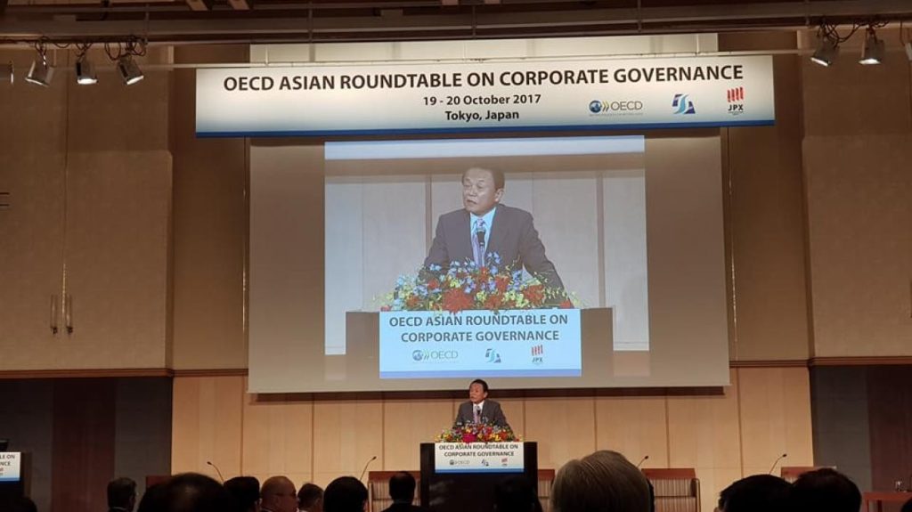 ဂျပန်နိုင်ငံအစိုးရ၏ အကူအညီ၊ Financial Services Agency of Japan နှင့် Japan Exchange Group နှင့် စီးပွားရေးပူးပေါင်းဆောင်ရွက်မှုနှင့် ဖွံ့ဖြိုးတိုးတက်မှုအဖွဲ့အစည်း (အိုအီး စီဒီ) တို့၏ ပူးပေါင်းစီစဉ်မှုဖြင့် ဂျပန်နိုင်ငံ၊ တိုကျိုမြို့ရှိ Grand Prince Hotel Takanawa ၌ ၂၀၁၇ ခုနှစ် အောက်တိုဘာလ ၁၉ ရက်နေ့မှ ၂၀ ရက်နေ့အထိ ၂ ရက်ကြာ ကျင်းပလျက်ရှိသည့် အိုအီးစီဒီ-အာရှဒေသ ကော်ပိုရိတ်စီမံအုပ်ချုပ်မှုဆိုင်ရာဆွေးနွေးပွဲသို့ မြန်မာနိုင်ငံရင်းနှီးမြှုပ်နှံမှု ကော်မတီအတွင်းအရေးမှူး၊ ရင်းနှီးမြှုပ်နှံမှုနှင့် ကုမ္ပဏီများညွှန်ကြားမှုဦးစီးဌာန ညွှန်ကြားရေး မှူးချုပ် တက်ရောက်လျက်ရှိပါသည်။ ဆွေးနွေးပွဲတွင် ဂျပန်နိုင်ငံ၊ ဒုတိယဝန်ကြီးချုပ်၊ Minister of Finance, Minister of State for Financial Services, Minister in charge of Overcoming Deflation ဖြစ်သူ Mr. Taro Aso မှ အဖွင့်အမှာစကားပြောကြားခဲ့ပြီး OECD Asian Equity Market Review ကို မိတ်ဆက်ပေးမည်ဖြစ်ကာ ကုမ္ပဏီများအနေ ဖြင့် ရင်းနှီးငွေပိုမိုအသုံးပြုလာစေရန်၊ Corporate Governance တွင် ပါဝင်သည့် Stock Exchange ၏ အခန်းကဏ္ဍနှင့် ကုမ္ပဏီများရှိ ဒါရိုက်တာများ ပိုမိုစွမ်းဆောင်ရည် ပြည့်ဝစေရန် အကဲဖြတ်ခြင်းတို့နှင့်ပတ်သက်၍ ဆွေးနွေးကြမည်ဖြစ်သည်။
