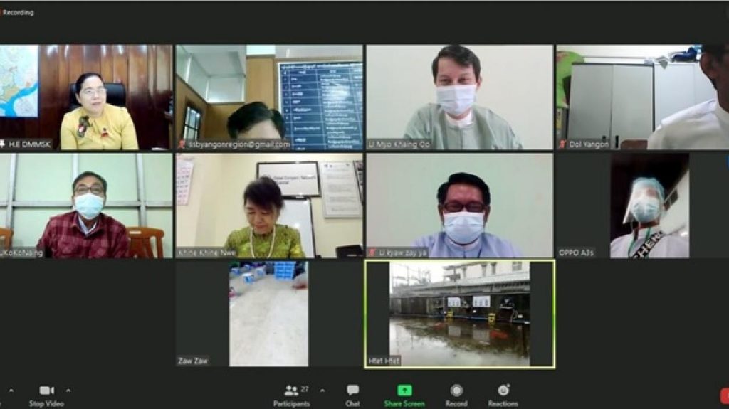 ရန်ကုန်တိုင်းဒေသကြီး ရင်းနှီးမြှုပ်နှံမှု လုပ်ငန်းများ ကြီးကြပ်ရေး အဖွဲ့မှ တာဝန်ရှိပုဂ္ဂိုလ် များ ပါဝင်သော အဖွဲ့သည် ရွှေပြည်သာ မြို့နယ် နှင့် လှိုင်သာယာမြို့နယ် အတွင်းရှိ CMP စနစ်ဖြင့် လုပ်ငန်းများ ဆောင်ရွက်နေသော Myanmar Solamoda Garments Company Limited, Shweyi-Zabe Garment Manufacturing Company Limited, Jiangusu Soho (Myanmar) Industry Company Limited and Oli-Tex Myanmar Limited များ၌ ကျန်းမာရေးနှင့် အားကစား ဝန်ကြီးဌာနမှ ထုတ်ပြန်ထားသော Coronavirus Disease 2019(COVID-19) ရောဂါကာကွယ် ထိန်းချုပ်ရေးနှင့် ပတ်သက်သည့် လမ်းညွှန်ချက်များ လိုက်နာဆောင်ရွက်ထားရှိမှု အခြေအနေ တို့ကို ၂၀၂၀ ပြည့်နှစ် အောက်တိုဘာလ ၂၀ ရက်နေ့တွင် Video Conferencing အသုံးပြု၍ စိစစ်ခဲ့ပြီး လိုအပ်သည်များကို ပေါင်းစပ်ညှိနှိုင်း ဆောင်ရွက်ပေးခဲ့ပါသည်။