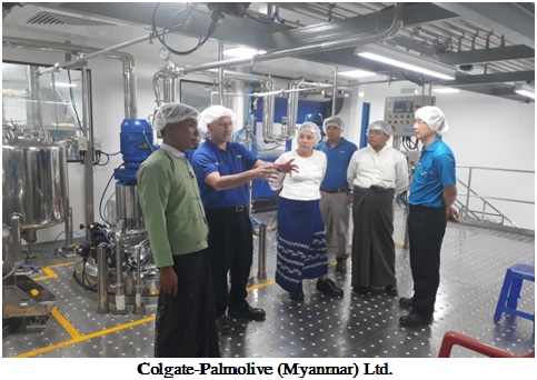 မြန်မာနိုင်ငံရင်းနှီးမြှုပ်နှံမှုကော်မရှင်၏ခွင့်ပြုမိန့်ဖြင့် ဆောင်ရွက်လျက်ရှိသော အရက် ပါဝင်ခြင်း မရှိသော အဖျော်ယမကာနှင့် သောက်ရေသန့်များထုတ်လုပ်ဖြန့်ဖြူးခြင်း လုပ်ငန်း ဆောင်ရွက်လျက်ရှိသည့် လှိုင်သာယာစက်မူဇုန်နှင့် မှော်ဘီမြို့နယ်၊ ရန်ကုန်တိုင်းဒေသကြီးရှိ Coca-Cola Pinya Beverages Myanmar Ltd. နှင့် Oral Care Products နှင့် Personal Care Products အမျိုးမျိုးထုတ်လုပ်ဖြန့်ဖြူးခြင်းလုပ်ငန်း ဆောင်ရွက်လျက်ရှိသော ရွှေပြည်သာ စက်မူဇုန်၊ ရွှေပြည်သာမြို့နယ်၊ ရန်ကုန်တိုင်းဒေသကြီးရှိColgate-Palmolive (Myanmar) Ltd.သို့ ရင်းနှီးမြှုပ်နှံမှုနှင့်ကုမ္ပဏီများညွှန်ကြားမှုဦးစီးဌာန၊ အလုပ်သမားညွှန်ကြားမှု ဦးစီးဌာန၊ ပတ်၀န်းကျင်ထိန်းသိမ်းရေးဦးစီးဌာနနှင့် စက်မှုကြီးကြပ်ရေးနှင့် စစ်ဆေးရေးဦးစီးဌာနတို့မှ တာဝန်ရှိပုဂ္ဂိုလ်များပါ၀င်သည့် ကွင်းဆင်းစစ်ဆေးရေးအဖွဲ့သည် ကုမ္ပဏီ၏ သုံးလပတ် အစီရင်ခံစာ၊ ထုတ်လုပ်မှုအခြေအနေ၊ စီးပွားဖြစ်စတင်ဆောင်ရွက်ပြီးအခြေအနေ၊ အလုပ်သမား ခန့်ထားမှု၊ ပတ်၀န်းကျင်စီမံခန့်ခွဲမှုအစီအစဉ်၊ ပုဂ္ဂလိကစက်မှုမှတ်ပုံတင်၊ လုံခြုံမှုအထောက် အထားလက်မှတ်နှင့် မတည်ငွေထည့်၀င်မှုအခြေအနေစသည်များကို ၂၀၁၇ ခုနှစ်၊ မတ်လ ၃၁ ရက်နေ့တွင် သွားရောက်စစ်ဆေးပြီး လိုအပ်သည်များကို ပေါင်းစပ်ညှိနှိုင်း ဆောင်ရွက်ပေးခဲ့ ပါသည်။