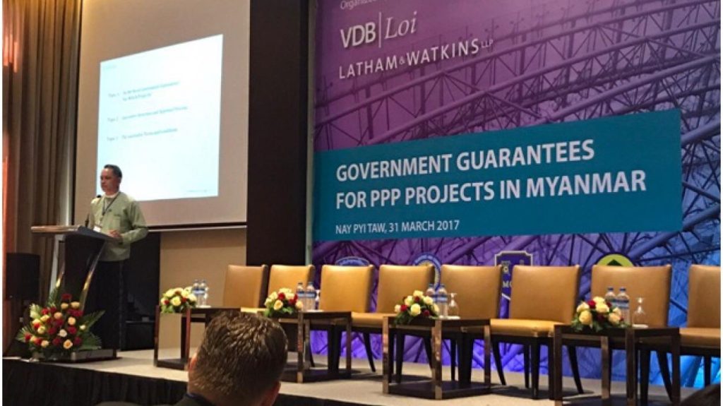 Government Guarantees for Public Private Partnership (PPP) Projects in Myanmar ဆိုင်ရာ အလုပ်ရုံဆွေးနွေးပွဲအား ၂၀၁၇ ခုနှစ် မတ်လ ၃၁ ရက်နေ့ နံနက် ၉ း ၃၀ နာရီ တွင် နေပြည်တော်ရှိ Park Royal Hotel၌ ကျင်းပပြုလုပ်ခဲ့ပါသည်။ အဆိုပါအလုပ်ရုံ ဆွေးနွေးပွဲတွင် ရင်းနှီးမြှုပ်နှံမှုနှင့်ကုမ္ပဏီများညွှန်ကြားမှုဦးစီးဌာန ၊ညွှန်ကြားရေးမှူးချုပ် ဦးအောင်နိုင်ဦးမှ အဖွင့်အမှာစကား ပြောကြားခဲ့ပါသည်။ အလုပ်ရုံဆွေးနွေးပွဲသို့ အစိုးရဌာနများ မှ အဆင့်မြင့် အရာရှိကြီးများနှင့် ပုဂ္ဂလိကကဏ္ဍမှ ပုဂ္ဂိုလ်များ/လုပ်ငန်းရှင်များ စုစုပေါင်း(၁၅၀ ) ဦးခန့် တက်ရောက်ခဲ့ပါသည်။