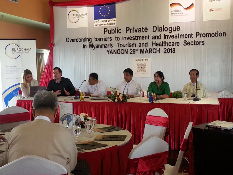 Euro Cham နှင့် GIZ တို့ ပူးပေါင်း၍ ၂၀၁၈ ခုနှစ် မတ်လ ၂၉ ရက်နေ့တွင် Rose Garden Hotel ၌ ကျင်းပသည့် ခရီးသွားလုပ်ငန်းကဏ္ဍနှင့် ကျန်းမာရေး စောင့်ရှောက်မှုကဏ္ဍများတွင် ရင်းနှီးမြှုပ်နှံမှုအတား အဆီးများနှင့် ရင်းနှီးမြှုပ်နှံမှုမြှင့်တင်ခြင်းဆိုင်ရာ အစိုးရ-ပုဂ္ဂလိက အလုပ်ရုံဆွေးနွေးပွဲသို့ ဒုတိယညွှန်ကြား ရေးမှူးချုပ် ဒေါက်တာမာလာမျိုးညွန့် တက်ရောက်ခဲ့ပြီး Current Trends and Outlook of Investment in Myanmar ခေါင်းစဉ်ဖြင့် ပါဝင်ဆွေးနွေးခဲ့ပါသည်။